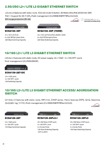 L2/Lite L3 features with static route, 1G/2.5G multi-G Switch, 90 Watts Ultra PoE (ECS4155-30P) L2+/Lite L3 features with static route, RIPv1/v2, DHCP server, Metro features ERPS, QinQ, Selective QinQ,