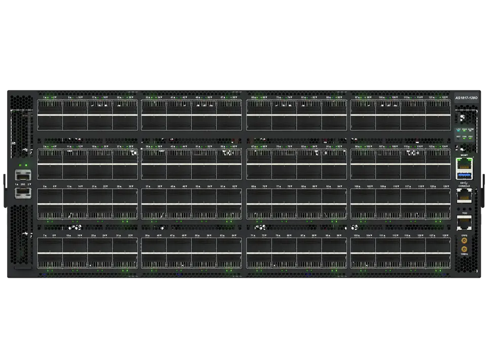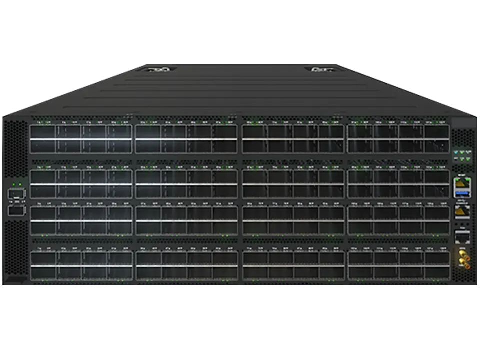 Offers 128 x 800G (OSFP800) ports. Supports up to 512 logical ports (High Radix) on a single chip to maximize network scale.