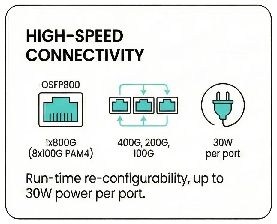 Offers 128 x 800G (OSFP800) ports. Supports up to 512 logical ports (High Radix) on a single chip to maximize network scale.