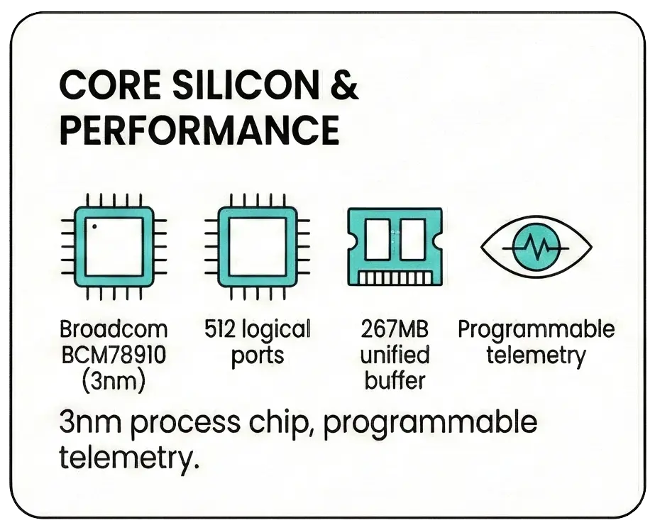 Chipset : Broadcom Tomahawk 6P BCM78910 (3nm monolithic process).