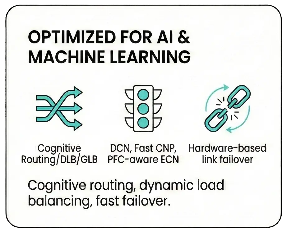 Reduces Job Completion Time (JCT) using Cognitive Routing, Dynamic Load Balancing (DLB), and Global Load Balancing (GLB) with sub-microsecond latency.