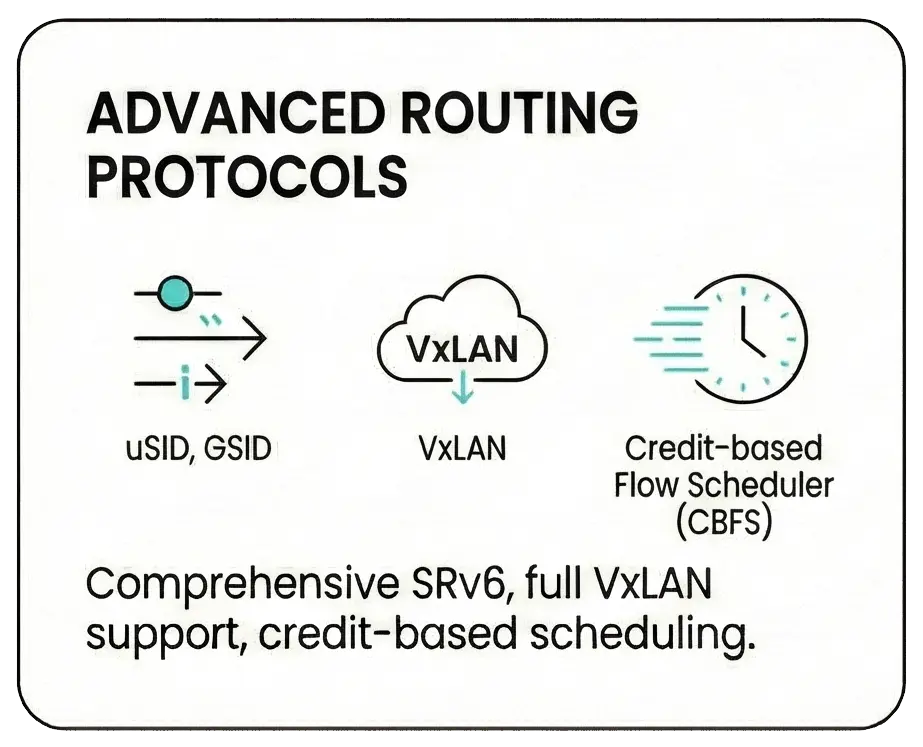 SRv6 Support : Comprehensive support including Micro SID (uSID), Generalized SID (GSID), and canonical/non-canonical modes (Subject to NOS).