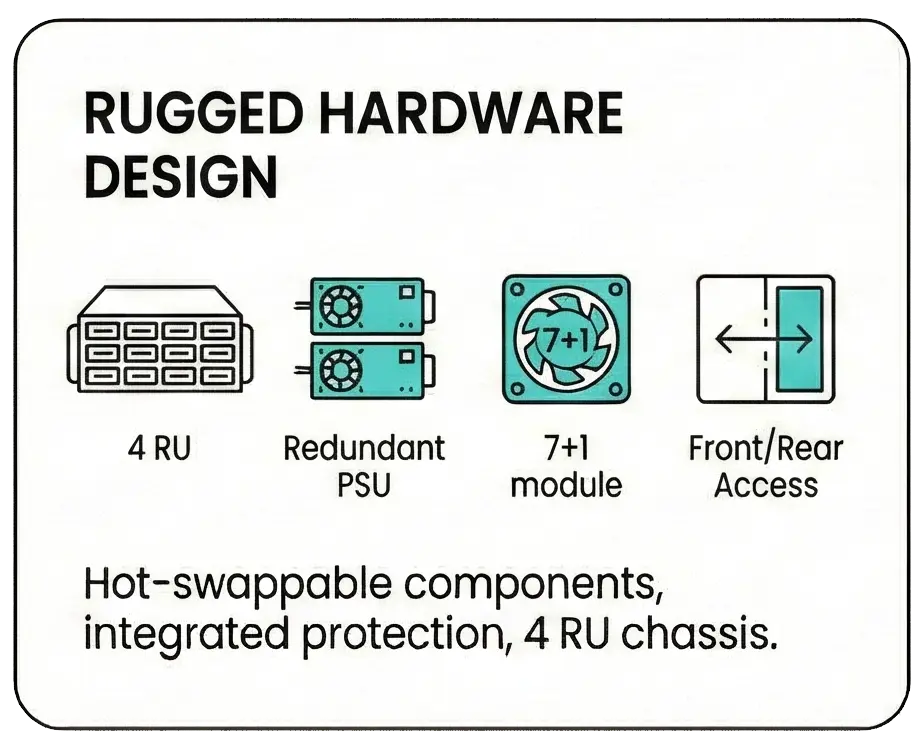 Power & Cooling : Hot-swappable 3200W AC/DC PSUs (redundant) and 7+1 redundant fan modules.
