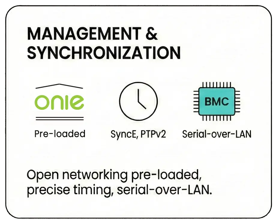 Timing : SyncE and PTPv2 support (1PPS, 10MHz, and ToD connectors).